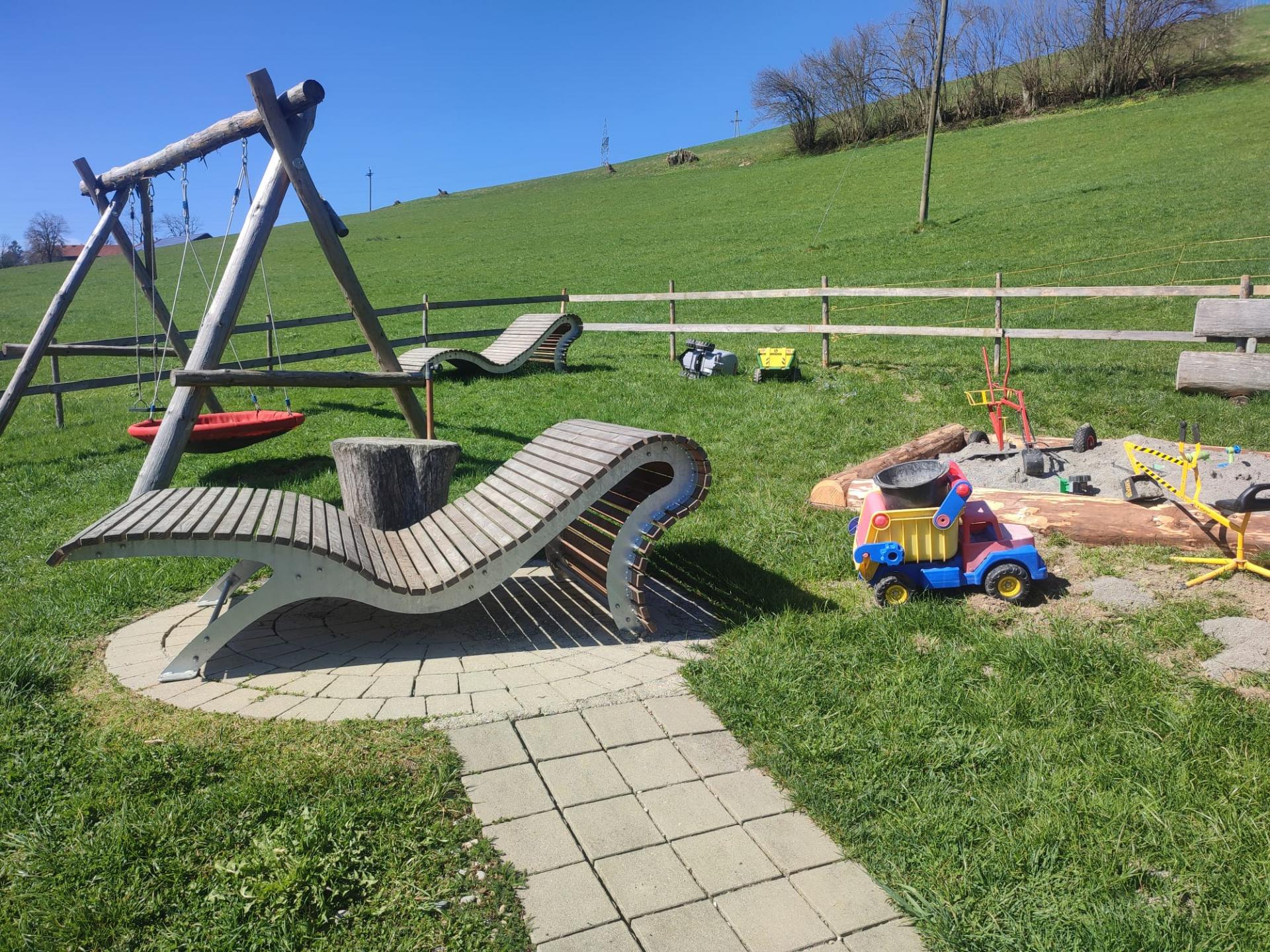 Gerne laden wir Sie ein, vor unserem Hofladen Platz zu nehmen und die Aussicht zu genießen. Entspannen Sie sich, während die Kinder im Sandkasten spielen oder auf der Schaukel schwingen.