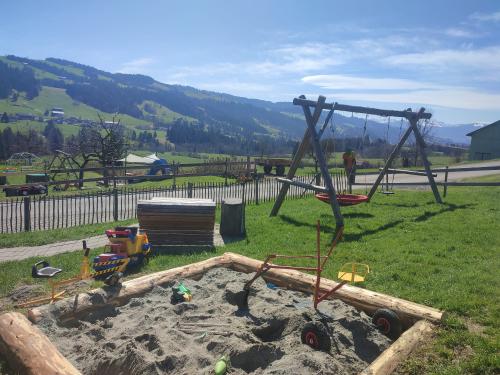 Gerne laden wir Sie ein, vor unserem Hofladen Platz zu nehmen und die Aussicht zu genießen. Entspannen Sie sich, während die Kinder im Sandkasten spielen oder auf der Schaukel schwingen.